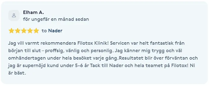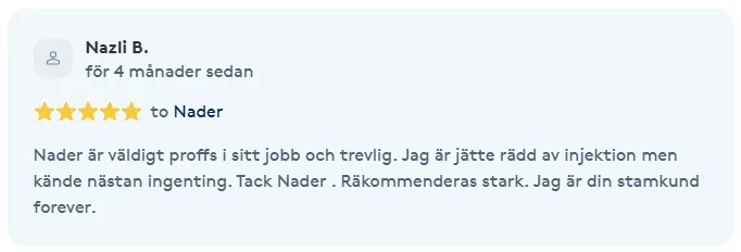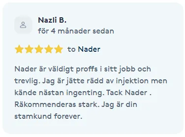 Alla behandlingar hos oss utförs av Nader som är en legitimerad och certifierad sjuksköterska (inte en doktor) med specialkompetens inom injektioner med lång erfarenhet och en passion för detaljer.
